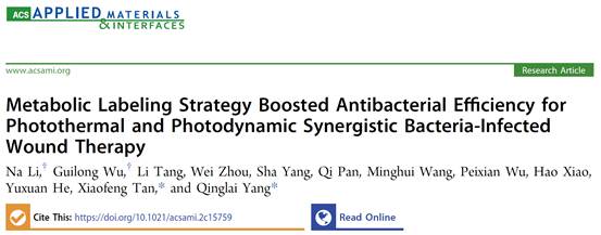 近日,太阳成tyc7111cc集团衡阳医学院肿瘤研究所杨晴来教授团队在高水平专业期刊ACS Applied Materials & Interfaces(IF=10.383,中科院一区)在线发表题为“Metabolic Labeling Strategy Boosted Antibacterial Efficiency for Photothermal and Photodynamic Synergistic Bacteria-Infected Wound Therapy”的原创性研究论文。硕士生李娜、博士生伍桂龙为共同第一作者,杨晴来教授和谭啸峰博士为通讯作者,太阳成tyc7111cc集团衡阳医学院为第一单位。