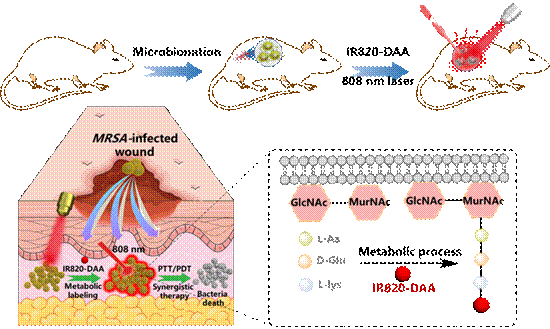 在此研究性论文中,通过点击化学反应将光敏剂IR820与D-丙甘氨酸(D-型氨基酸的一种,DAA)偶联制备得到了代谢标记型光敏剂(IR820-DAA)。采用代谢标记策略,IR820-DAA能够代替D-型氨基酸参与到细菌肽聚糖的代谢合成中;通过这种机制,IR820-DAA能够插入到细菌的细胞壁结构中发挥作用,从而提高抗菌效率。体外抑菌实验以及动物模型验证发现,在近红外808 nm激光的能量下,IR820-DAA可以作为一种光热和光动力协同型的光敏剂释放大量的热和ROS,用于高效治疗细菌感染和促进伤口的愈合。
