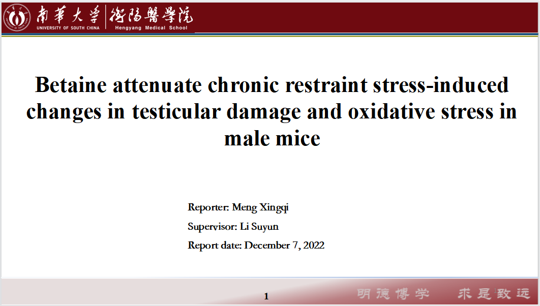 第三位报告人孟星圻在线上作《Betaine attenuate chronic restraint stress-induced changes in testicular damage and oxidative stress in male mice》主题报告,介绍了甜菜碱对慢性精子畸形的作用以及机制,并重点介绍了文章中CRS小鼠具体造模的方式。其报告逻辑严谨,科研精神值得大家学习。