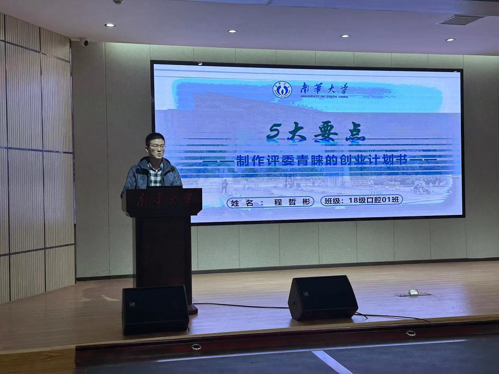 衡阳医学院18级口腔01班程哲彬同学以《5大要点—制作评委青睐的创业计划书》为主题,结合自己1年来的参赛经历,分享了自己撰写计划书的心得与经验。他结合典型案例对如何写好计划书进行了实战指导,还着重阐述了“项目背景”“产品介绍”“团队成员”等部分的撰写要求与技巧。最后,他鼓励同学们积极参加比赛,成就自我、为学院争光。