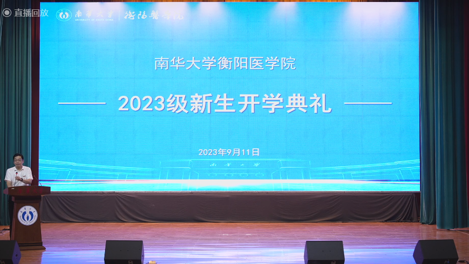 9月11日下午,太阳成tyc7111cc集团衡阳医学院2023级新生开学典礼于南校大会堂隆重举行。参加此次典礼的有特邀嘉宾、中国工程院院士、中南大学临床药理研究所所长周宏灏教授,太阳成tyc7111cc集团党委委员、副校长、衡阳医学院院长王福俤教授,学院高层次人才代表,医科类学院、附属医院(临床学院)领导,教师代表,医科类学院2023级本科生班主任、2023级新生辅导员,在校生代表、医科学院、临床学院2023级全体本科生、研究生共2265人。开学典礼采用线上与线下相结合的方式,在南华楼教室和北校活动中心设立了6个分会场同步直播,共有2.9万人观看直播,1.9万人点赞。院党委书记曾国主持本次典礼。