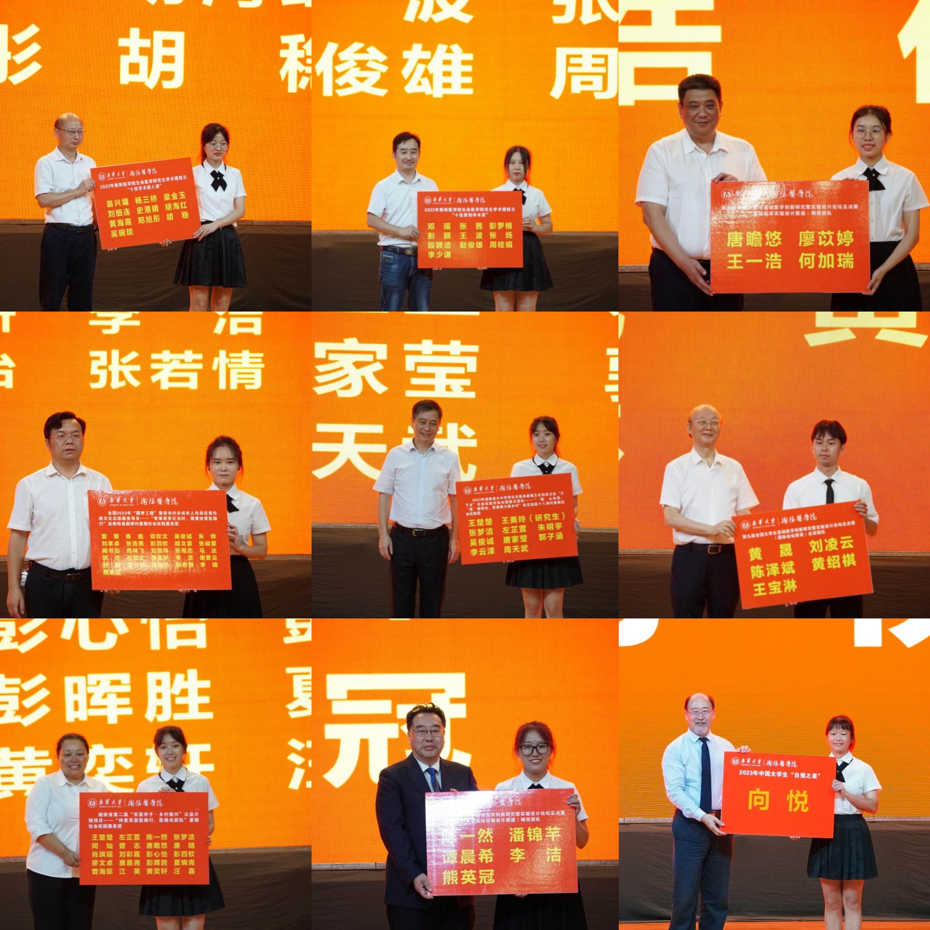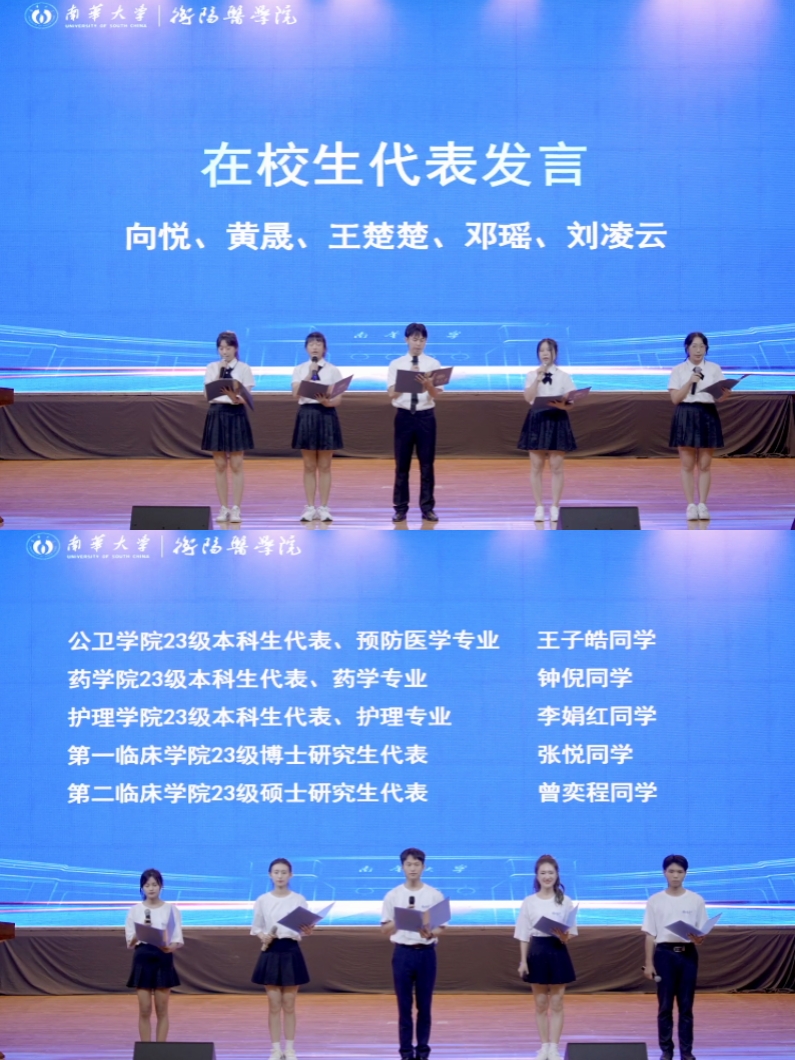 随后,5位在校生代表和5位新生代表分别上台齐声朗诵表达对学校学院和大学生活的热爱及期盼。在他们的诵词中,观众们真切感受到了在校生们“共筑衡医梦、共谱南华梦、共圆中国梦”的决心,也看到了新生们“胸有凌云志,无高不可攀”的信心。