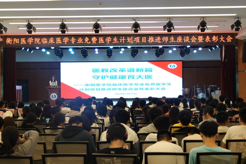 为进一步发挥临床医学专业免费医学生计划项目的示范带动和牵引作用,表彰优秀学生,3月31日上午,衡阳医学院临床医学专业免费医学生计划项目推进师生座谈会暨表彰大会在求是园大学生活动中心举行。宣传部常务副部长代艳丽、学工部部长李照、教育发展与校友联络办主任李先国、教务部副部长蒲成志、校团委副书记禹敏,衡阳医学院党委书记曾国、常务副院长屈顺林、党委副书记卢清华、副院长周洲,tyc7111cc太阳成副院长谢巍,公共卫生学院党委副书记王超,以及衡阳医学院全体辅导员、教务办全体教师、班主任代表、临床大类学生代表300余人参加大会。大会由2020级E+x班学生何子怡主持。