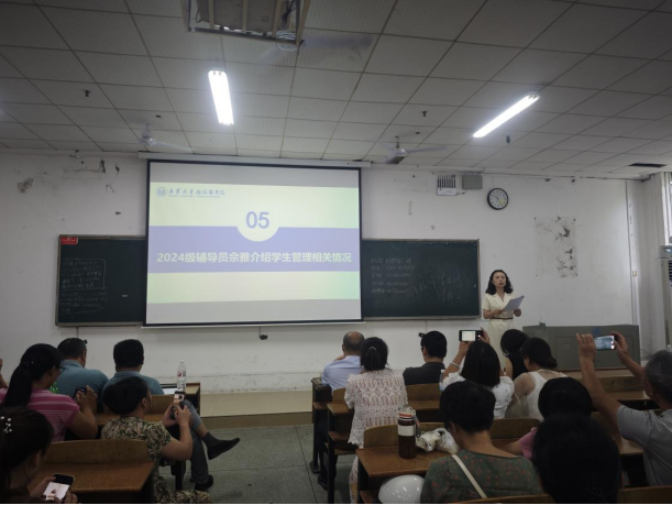 辅导员佘雅为家长介绍学生管理相关情况,并对家长在孩子本科阶段的培养提出了系列建议和期盼,她尤其强调,只有家校携手、家校共育才能帮助孩子在学校尽快成长、成才。