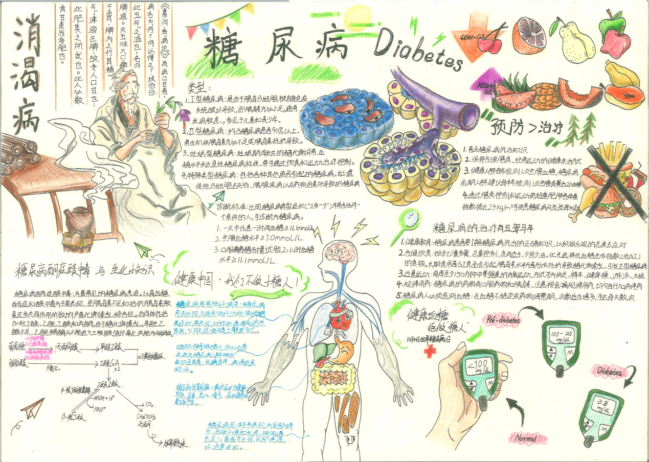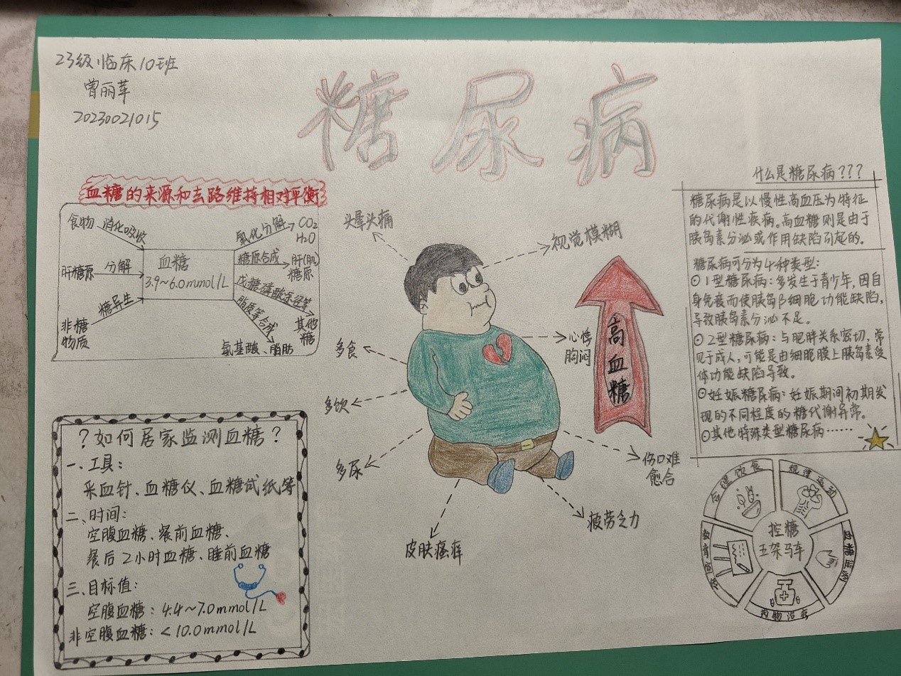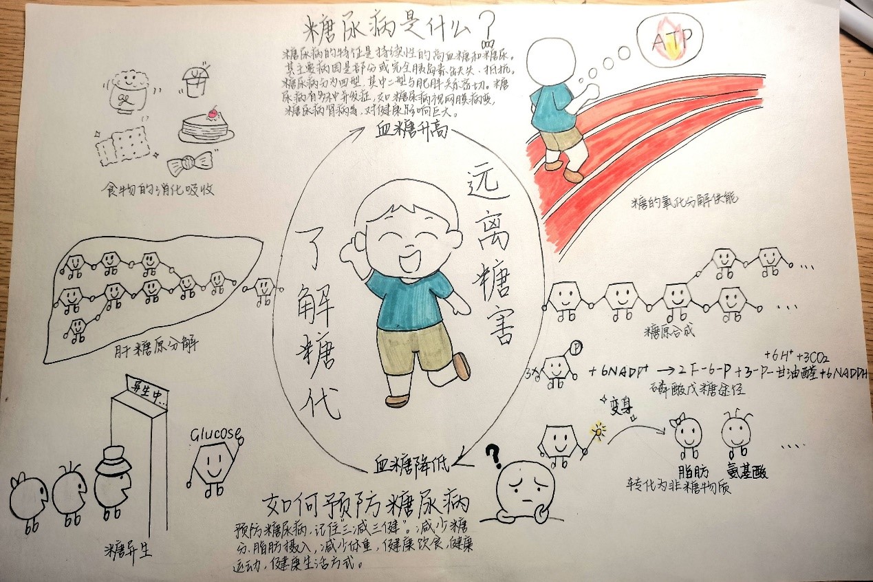 在创作过程中,学生们深入查阅文献和资料,将复杂的生物化学原理用图表、卡通插画等方式呈现,简明直观地传递出“合理膳食、适量运动、规律体检”等糖尿病预防关键点。
