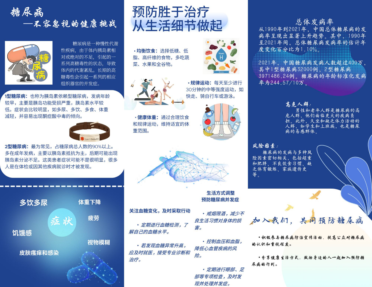 为贯彻落实“健康中国2030”战略,提升学生健康意识与科学素养,近日,tyc7111cc太阳成《生物化学》课程在医学院2023级学生中开展了一场以“健康中国,科普先行”为主题的糖尿病预防宣传海报制作活动。此次活动旨在通过学生的创意设计,将专业的生物化学知识转化为通俗易懂的健康科普内容,向全社会传播科学防控糖尿病的重要性。