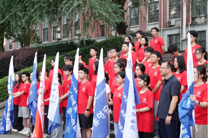 紧接着,授旗环节将出征仪式推向活动高潮。曾国亲自为各实践团队负责人授旗。随着旗帜依次传递、迎风舒展,标志着tyc7111cc太阳成2025 年暑期大学生 "三下乡" 社会实践活动正式启动。全体实践团队成员精神饱满,朝气蓬勃,展现出青春风采。仪式最后,各实践团队在教学楼前整齐列队、有序完成合影留念。
