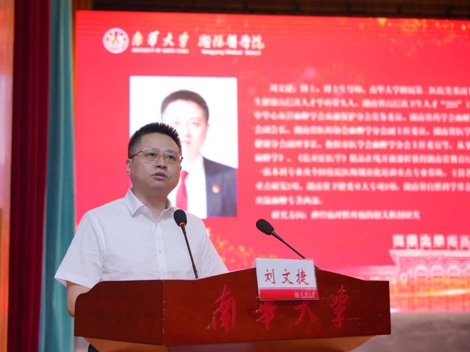临床教师代表刘文捷以医学视角阐释“明德、博学、求是、致远” 校训,结合从医经历助力新生迅速适应从高中生到大学生的角色转变。作为麻醉医生,他寄语麻醉学系新生“麻醉医生是守护手术过程中全身生命体征的哨兵,任务艰巨,意义重大”,也告诉麻醉新生有三重大礼:高端设备师资、完备培养体系、专门奖学金。他勉励新生,过好在校园的每一天,以对应精神践行南华校训,实现个人成长与守护健康的完美融合。