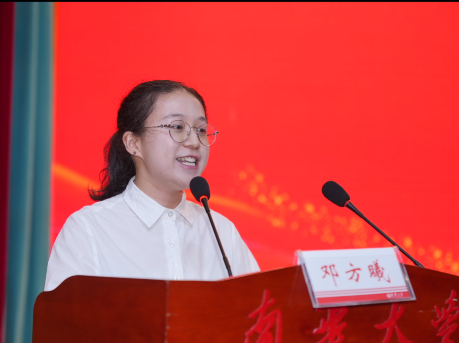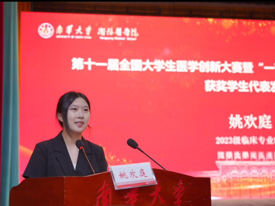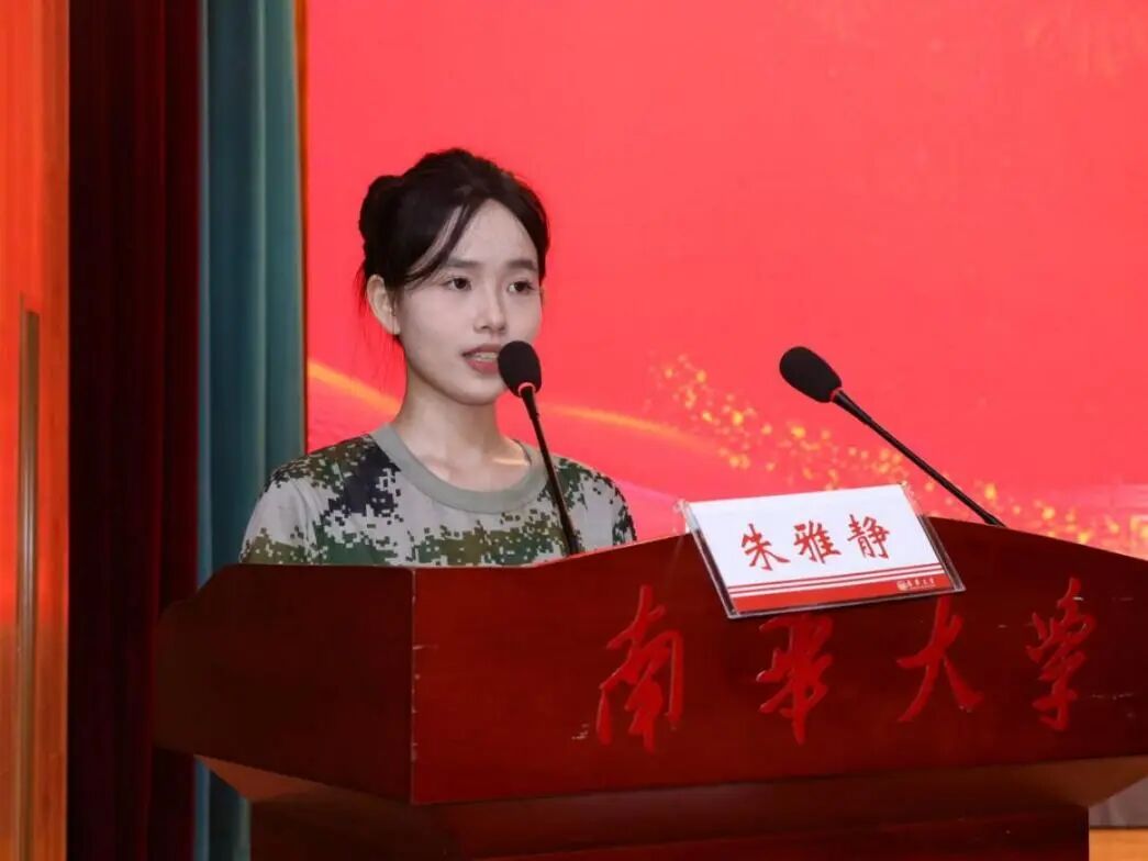 新生代表朱雅静分享了自己对大学生活的期待与规划。她提及初入南华时的憧憬,以“苔花如米小,也学牡丹开”共勉,立志恪守校训,在南华成长为能造福一方的医者。
