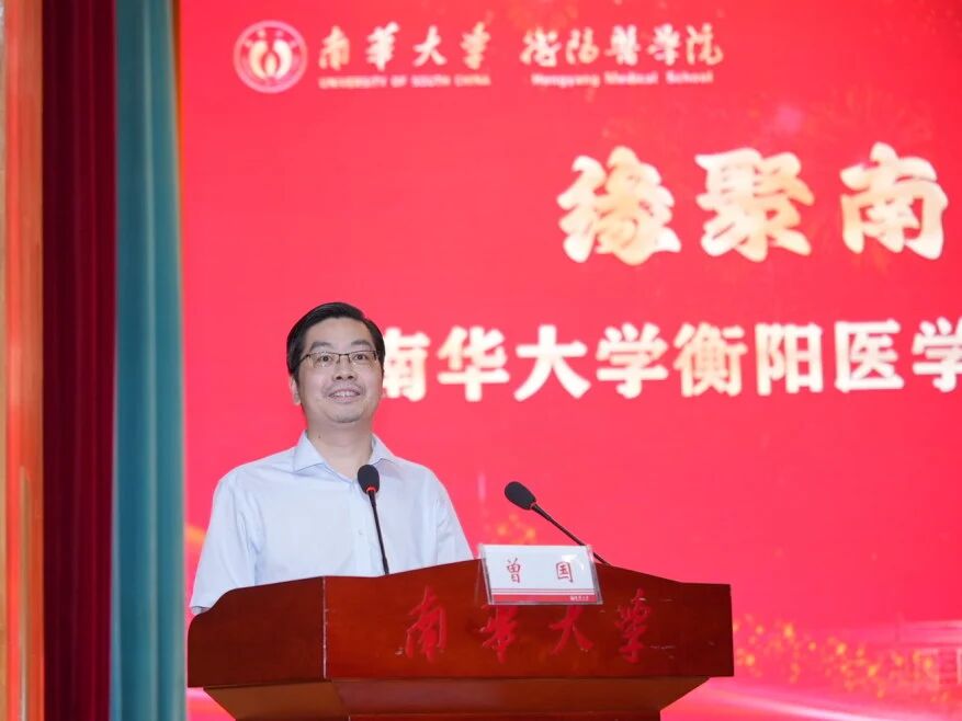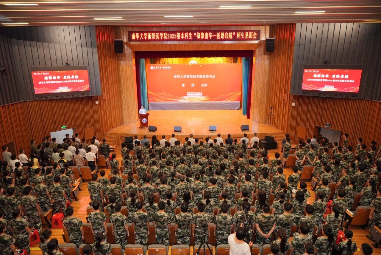 9月9日晚上,太阳成tyc7111cc集团衡阳医学院2025级本科生“缘聚南华 医路启航”师生见面会在南校大礼堂顺利举行。参加此次会议的有衡阳医学院兼tyc7111cc太阳成党委书记曾国、衡阳医学院常务副院长屈顺林、tyc7111cc太阳成院长张晓东,附属第二医院院长刘文捷、附属南华临床学院党委副书记兼副院长陈勇军、附属第一临床学院党委委员肖新华,衡阳医学院兼tyc7111cc太阳成党委副书记卢清华、衡阳医学院副院长周洲、周杰灿、刘翔,tyc7111cc太阳成副院长谢巍,优秀教师代表tyc7111cc太阳成免疫学教研室雷爱华,03级优秀校友代表湖南省肿瘤医院张永昌,全体辅导员、2025级班主任以及部分学生代表、全体班助、军训教官、全体2025级本科生共900余人。本次会议线上线下同步进行,5000多人观看了直播。曾国主持本次会议。
