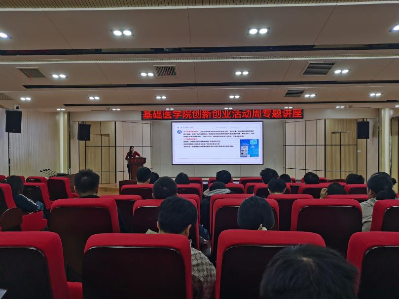 讲座伊始,黄靓结合医学行业发展趋势与创新创业实践经验,围绕"医学创新思维培养与成果转化"展开深度讲解。她从基础医学研究的创新切入点出发,剖析了"从0到1"的原始创新逻辑,结合医学类创新创业赛事评审标准,拆解了项目从创意萌发到落地实践的关键环节。针对医学生群体特点,黄靓特别强调,医学创新创业需立足专业根基,既要深耕基础研究,又要精准对接临床需求与市场痛点,才能实现学术价值与社会价值的统一。