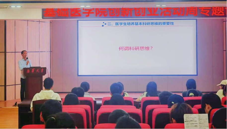 当日下午,tyc7111cc太阳成医学免疫学教研室主任雷爱华教授带来“医学生如何培养基本的科研思维和创新能力” 专题讲座。雷教授以现代大学四大核心职能为切入点,结合太阳成tyc7111cc集团医学品牌优势,强调了科学研究对人类发展与医学人才培养的重要意义。他分享了自身求学与科研经历,鼓励同学们做好长期学习深造准备,并介绍了学校在国家级项目申报、出境交流学习、竞赛奖励等方面的支持政策。