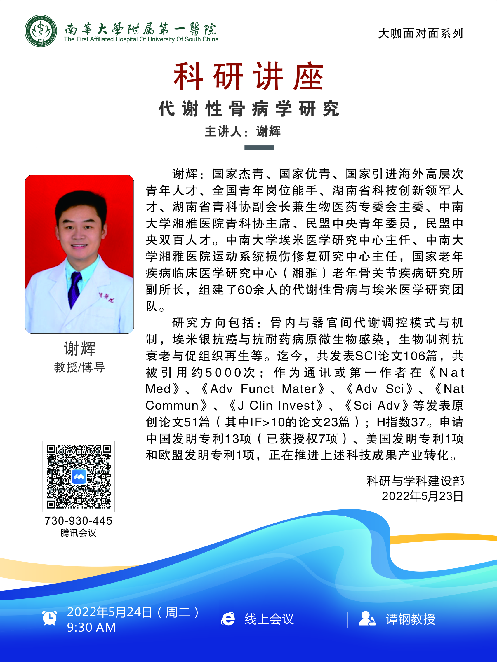上一条:科研讲座|附属第二医院博士论坛·第一期 下一条:科研讲座|附属第一医院大咖面对面系列:GPCR在骨科疾病的基础和药物研发