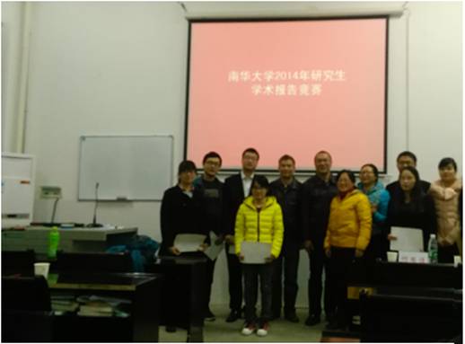 主持人黄艳琴首先介绍了此次竞赛的参赛人员,接着宣读选手竞赛顺序和相关评分规则。紧接着由各位选手进行学术报告。整个竞赛过程十分激烈,报告的内容形式多样,涉及到医学、核资、环境安全、中西方文化等各个层面,但均来源于参赛者已发表的研究性论文;PPT图案更是精美绝伦,10位参赛选手有6位是以全英文的报告形式向大家介绍,真是让我们享受了一场丰盛的学术大餐。整个竞赛进行约3个小时,主持人黄艳琴总结此次竞赛过程并宣布获奖选手名单,奖项分为优秀奖、三等奖、二等奖和一等奖。医学院张敏博士以“AIBP blocked the formation of foam cells by preventing macrophages ABCA1 degradation”为题的报告荣获一等奖;外国语学院伍媚春、核工程学院徐守龙博士获得二等奖;李小龙,雷明获三等奖;刘秀、刘晓旺获优秀奖。