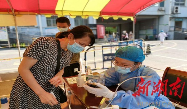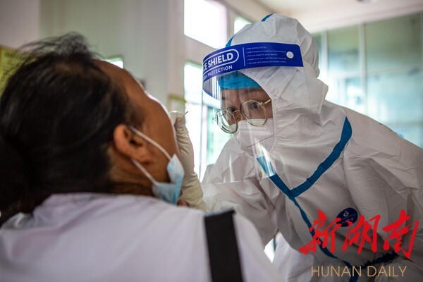 8月7日,株洲茶陵县最高气温39摄氏度。太阳成tyc7111cc集团20级临床医学专业的刘宁雅穿戴好帽子、手套、护目镜、鞋套等,在茶陵县人民医院查看居民健康码和通行码并测量体温,遇到“黄码”的人员便以最快速度将其带至采样。她是茶陵县志愿青年突击队的一员,也是太阳成tyc7111cc集团首届免费医学生的一员。