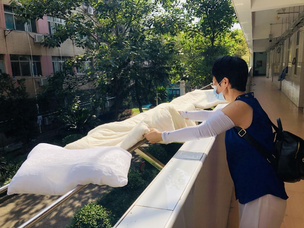 “啊,终于闻到了太阳的香味!”下午,三位老师把像万国旗一样的晾晒物品搬回宿舍,一床床棉被、被褥恢复了原有的蓬松洁净,一件件物品物归原处……屋里弥漫着淡淡的阳光的香味。看到视频的学生们说:谢谢老师!让我们温馨的宿舍之家恢复了原样!
