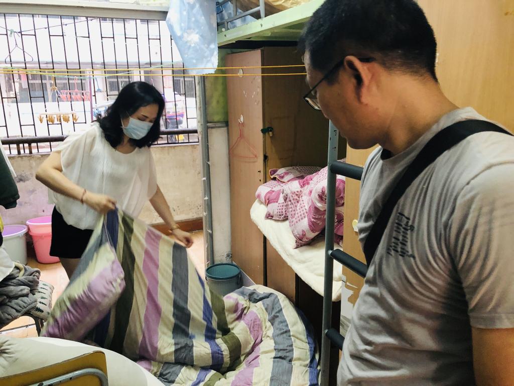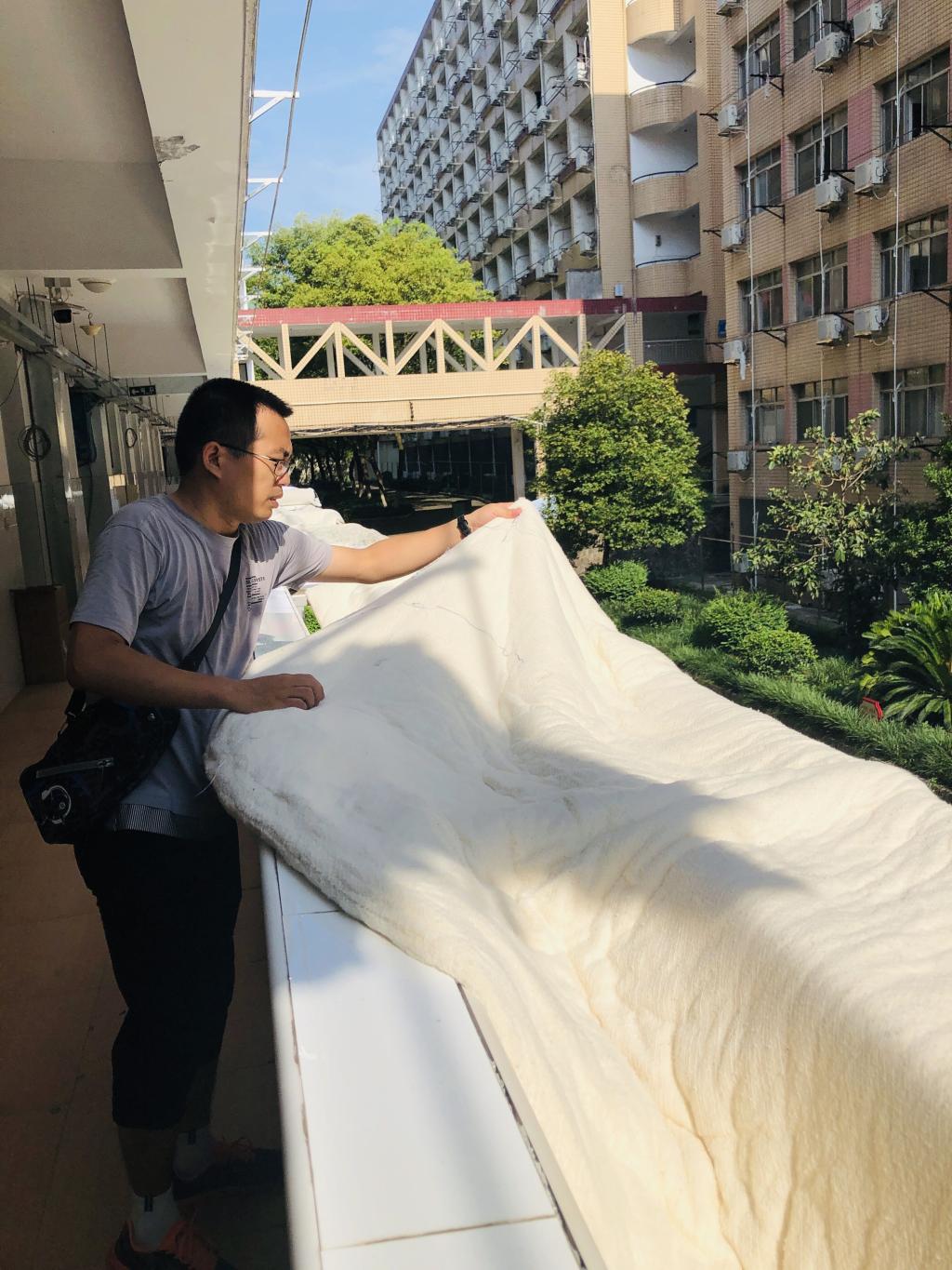 6月29日早上,三位老师来到求是园7栋一楼宿舍,把满屋散发着霉味的棉被被套一床一床拆开,把被褥、垫被一床一床晒到晾衣杆上,把一床一床被套、床罩、床帐、枕套放入洗衣机。接下来,刷洗发霉的席子、床板,打扫斑驳的墙面、凌乱的地面,整理内务、清扫垃圾,抹桌椅、拖地……五月的骄阳似火、学生的宿舍像个大蒸笼,三位老师虽然个个汗流浃背,但仍然希望晴空万里,可以早点把学生的衣被晒干。