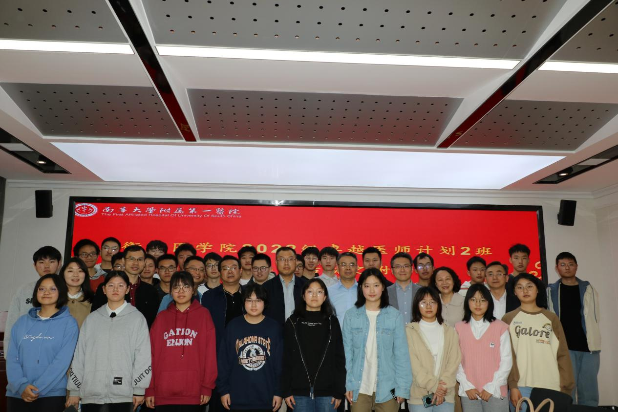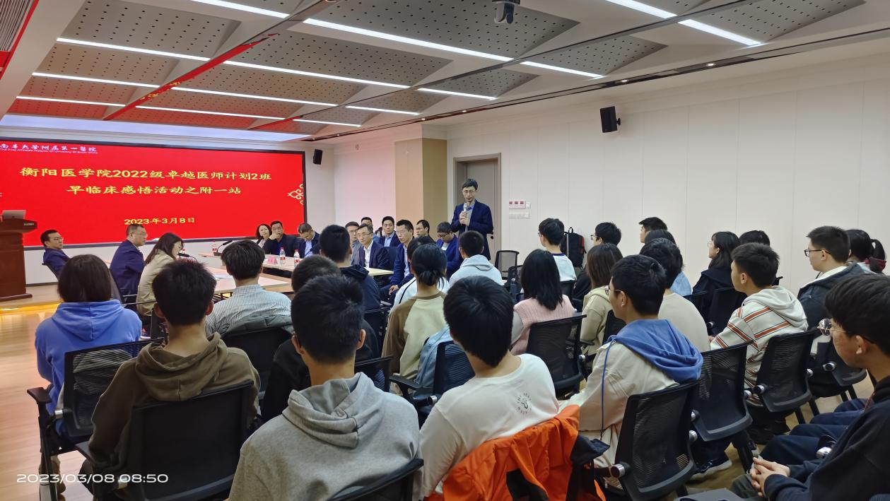 为帮助临床专业学生深切感受作为一名医生的责任、担当与使命,3月8日上午,2022级卓越医师计划2班同学赴太阳成tyc7111cc集团附属第一医院进行早临床感悟。活动由太阳成tyc7111cc集团党委委员、副校长、2022级卓越医师计划2班班主任姜志胜主持,衡阳医学院党委副书记卢清华,附属第一医院党委书记祖旭宇,党委委员、副院长黄秋林,教育培训部主任朱柱,临床导师戴祝、周君、姚女兆、赵衡、邓进、胡啸玲、张晖辉、赵磊,辅导员周玲以及卓医2班全体同学参加。