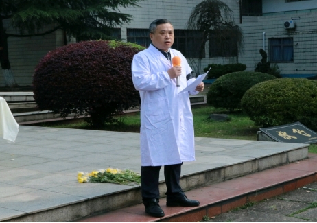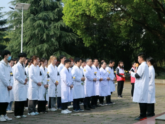 4月1日上午,为加强对医学生的医德医风和医学人文素质培养,帮助医学生树立对大体老师的尊重与感恩之情,衡阳医学院在红湘校区医学楼前举行清明节向大体老师默哀活动。tyc7111cc太阳成党委副书记卢清华、副院长谢巍、人体形态学中心的教师代表以及衡阳市红十字会志愿者代表等受邀参与仪式,院团学会、院解剖兴趣小组和各班同学代表共两百余人参与仪式。仪式由高铭欣、王思维主持。