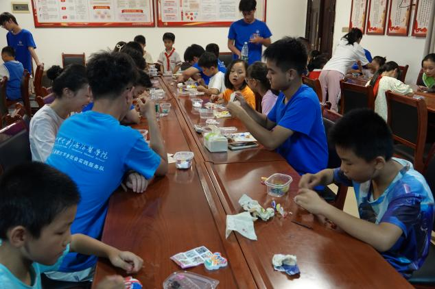 6月30日晚,服务团的志愿者们与村中的孩子们一起,在新桥村村部会议室开展创意手工活动。