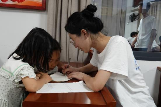 6月28日晚,服务团成员在新桥村村委会议室对当地儿童进行作业辅导。小朋友们齐齐围住服务团成员,其中一位小男孩更是兴奋地抱住一名去年来过新桥村的服务团成员:“哥哥,你又来看我啦!”