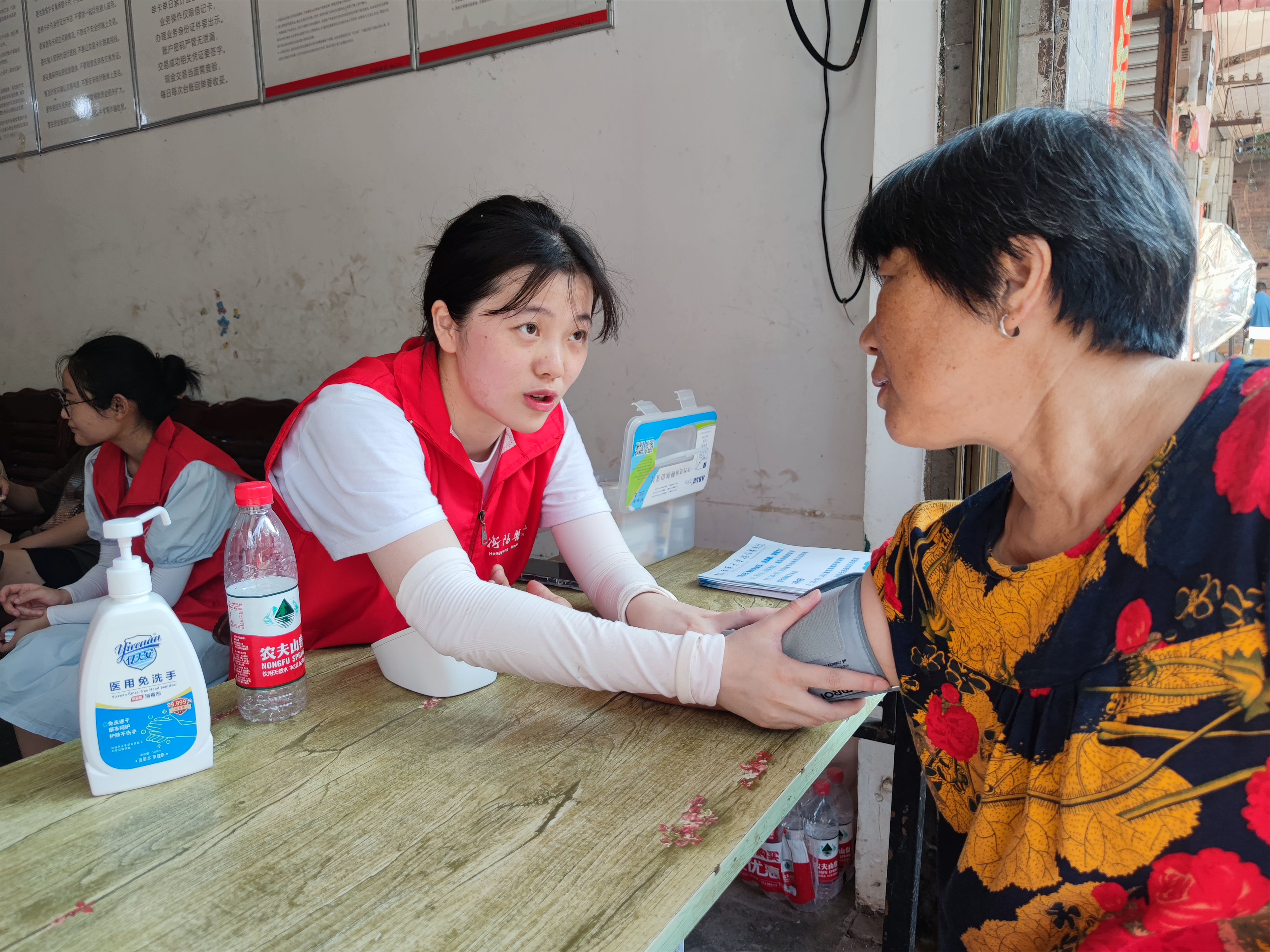 赶集日的早晨,这支实践团队早早来到了金桥镇的市集。他们准备好了血糖和血压测量的仪器设备,并悬挂起醒目的横幅,吸引了众多居民的注意,身穿统一的志愿者服装,他们摆放整齐的摊位,热情地迎接前来义诊和咨询的居民。