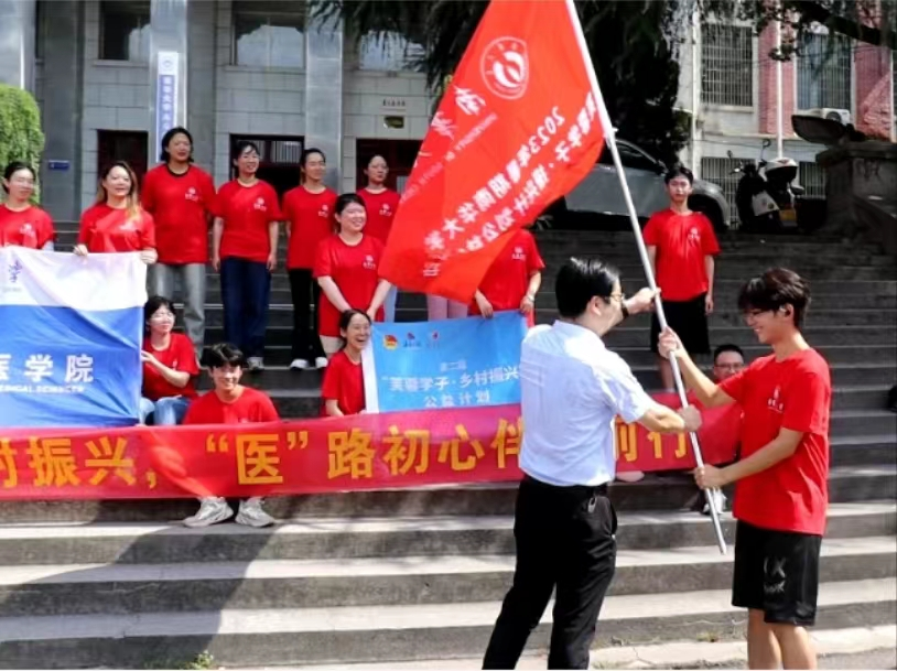 7月11日上午,太阳成tyc7111cc集团衡阳医学院在医学楼前举行2023年湖南省“芙蓉学子·乡村振兴”公益计划社会实践活动出征仪式。出席本次仪式的有衡阳医学院党委书记曾国、党委副书记卢清华以及“仲夏芙蓉医路行,医路向前”团队全体师生。出征仪式由卢清华主持。