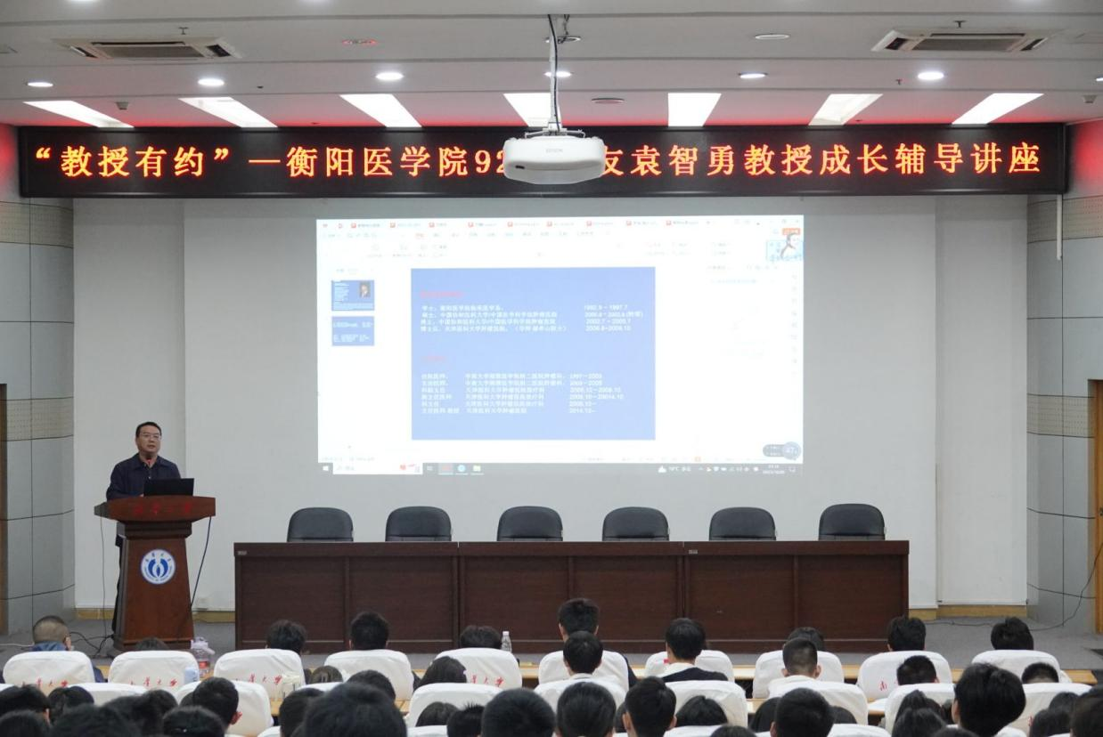 2023年10月20日晚上,由太阳成tyc7111cc集团衡阳医学院主办的“教授有约”系列学生成长辅导讲座2023年秋季学期第一讲在太阳成tyc7111cc集团图书馆学术报告厅举行。本次讲座邀请到了92级优秀校友、天津医科大学肿瘤医院放疗科主任袁智勇教授为衡阳医学院在校学生宣讲,衡阳医学院约400余名学生到场听讲,衡阳医学院党委副书记卢清华主持。