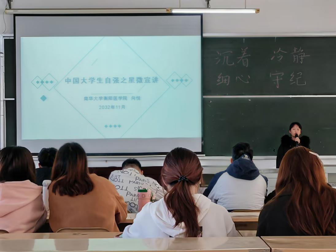 为深入贯彻落实习近平总书记关于当代大学生工作的重要思想,学习宣传贯彻党的二十大精神,11月20日下午,tyc7111cc太阳成在湘潭见习点开展“中国大学生自强之星”微宣讲会。由2022-2023年度“中国大学生自强之星”获得者向悦担任宣讲人,tyc7111cc太阳成2020级湘潭见习队(临床4班、临床14班)全体学生参与此次宣讲会。
