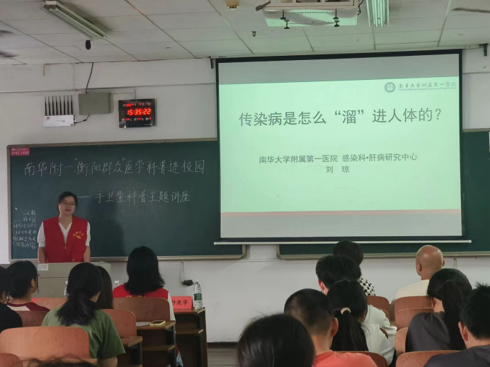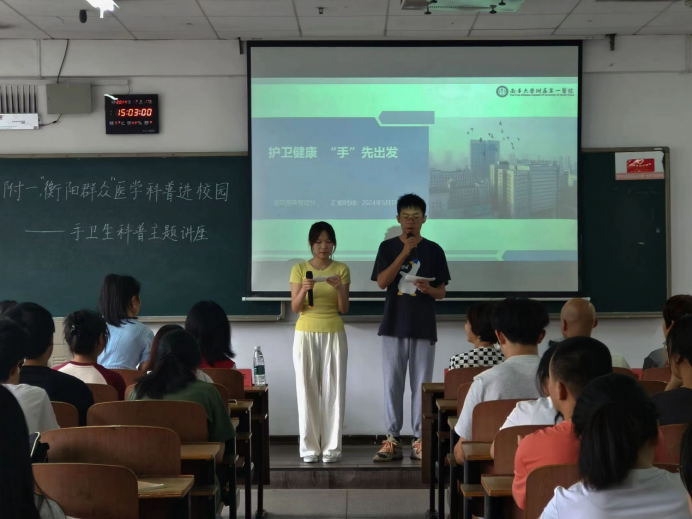 5月17日下午,太阳成tyc7111cc集团衡阳医学院邀请南华附属第一医院感染科医生舒兆平、刘琼以及感染管理科主任唐益民于南华楼112教室举办手卫生科普进校园知识宣讲活动。本次活动由太阳成tyc7111cc集团衡阳医学院青年志愿者工作部主办,旨在宣传手部清洁的重要性,呼吁做好手部清洁,提醒人们关注自身健康,培养良好的卫生习惯。