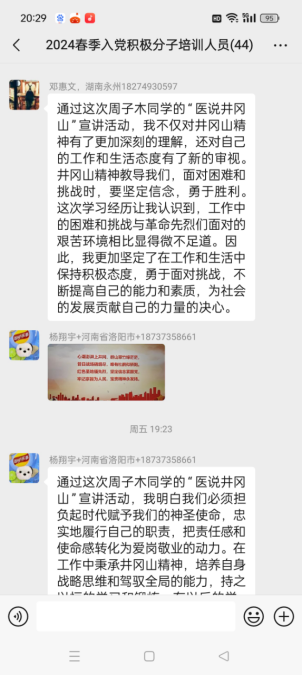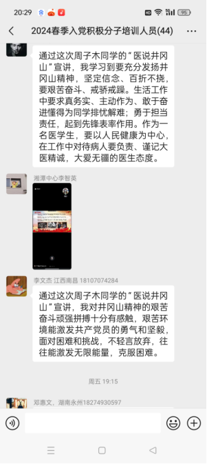 在宣讲中,宣讲团还讲述了红色井冈山的衡阳人周鲂的英雄事迹,赓续红色血脉的南华人王美玲、援非医生蔡泽民的奋斗故事。号召全体入党积极分子弘扬井冈山精神,补足精神之钙,要坚定共产党人的理想信念,把理想信念作为照亮前路的灯、把准航向的舵,转化为对奋斗目标的执着追求、对本职工作的不懈进取、对高尚情操的笃定坚持、对艰难险阻的勇于担当,要保持“革命理想高于天”的崇高追求,为实现中华民族伟大复兴贡献自己的力量。