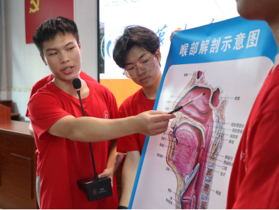 宣讲开始,实践团成员李泽彬与宋子豪以掏耳朵与晕车两个常见的小问题作为切入点,结合耳朵模型,与村民们互动,深入浅出的进行科普。他们以生动有趣的方式,从耳朵到喉咙,仔细向村民们介绍耳鼻喉中的各个部位以及一些疾病,包括中耳炎、鼻炎、咽喉炎等常见疾病的症状及识别方法,让村民们对自己的身体部位以及这些疾病有了初步的认识。为了增强宣讲过程的互动性和趣味性,李泽彬和宋子豪准备了许多个问题与在场的村民互动,现场气氛热烈。