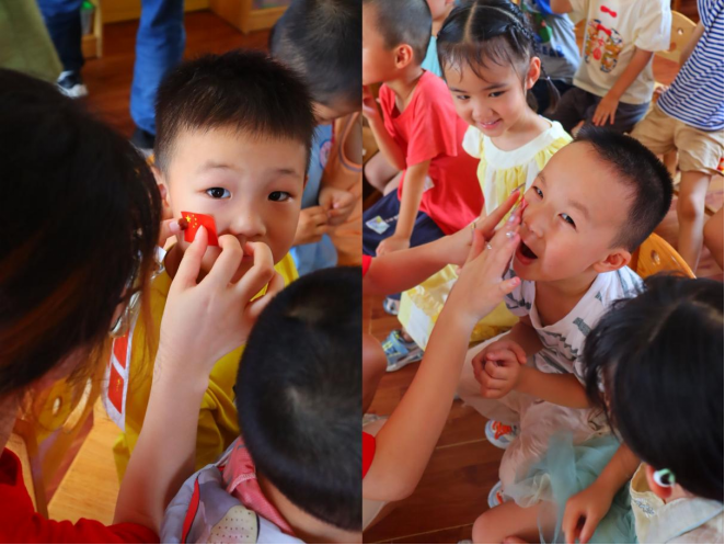 在爱国主义课程的高潮时刻,志愿者们带着一片五星红旗的贴纸,轻轻地贴在每位小朋友的右脸上。这一刻,那一枚小小的五星红旗,好的,成为校园的一部分,更成为孩子们心中永恒的记忆。