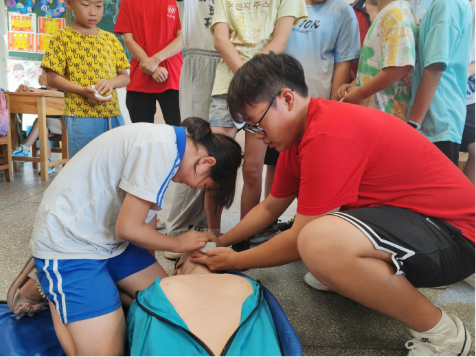 在志愿者的指导下,孩子们纷纷跃跃欲试,他们的小手紧紧握住模型,小心翼翼地模仿着志愿者的动作。虽然刚开始时显得有些生疏,但经过多次练习后,他们的动作逐渐变得熟练起来。每一次按压都凝聚着对生命的尊重与热爱,每一次呼吸都传递着对未来的希望与憧憬。