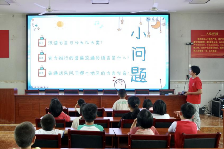 服务团成员们围绕“普通话起源”与“为什么要说普通话”两个主题,展开了生动有趣的讲解。他们通过历史故事、现实案例和互动问答等方式,深入浅出地阐述了普通话的起源、发展及其在国家统一、民族团结、经济发展等方面的重要作用。小孩子们听得聚精会神,津津有味。为了让孩子们更好地掌握普通话知识,服务团特别设置了“小小挑战”环节。该环节通过诗歌朗诵、绕口令比赛等形式,鼓励小孩子们积极参与推广活动当中。