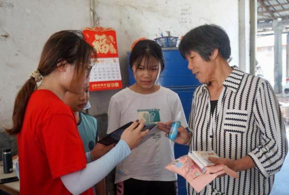 经过一个半小时的车程,团队顺利抵达本次社会实践活动的首站——衡阳县金溪镇金溪村,开展慰问孤寡老人、留守儿童和健康科普的公益活动。在金溪村村干部引导下,全体队员分成若干小组,逐一访问了八户家庭,为十余位老人送上了包括洗衣粉、面条在内的生活必需品。活动进行过程中,队员们与村民进行了深入的互动,全面了解了他们的日常生活状况。在与唐爷爷的交谈中,他热情地向队员们讲述了金溪村的历史沿革,并详细描述了国家扶贫政策实施后,村庄面貌的显著变化以及自家生活质量的稳步提升。言语间,唐爷爷展现了对未来生活的美好憧憬和坚定信心。在另一户村民家中,我们遇见了慈祥的唐奶奶。她欣喜地接受了队员们带来的物资,并与队员们进行了亲切的交谈。她感激地说:“谢谢你们在这么炎热的天气里还特地过来看望我们,送来这么多东西,还陪我们聊天,你们真是太辛苦了!”在离开唐奶奶家中时,她面带微笑地向队员们表达了感谢。