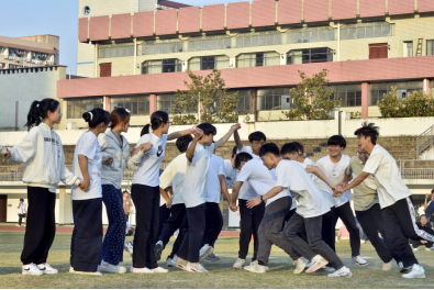 运动会首先进行了“三人夹球跑”项目。参赛选手们以三人为一组,携手夹着气球奔跑,充分展现了默契的配合和团队精神。经过激烈比拼,最终获胜的队伍赢得了在场师生的热烈掌声与喝彩。随后进行的“爱的魔力转圈圈”项目,不仅考验了选手们的耐力与毅力,更让大家体会到了运动的无穷乐趣。参赛选手们手挽手、心连心,从同伴的臂下穿梭而过,直至形成一个庞大的圆圈。在“十人九足”项目中,参赛选手们脚绑在一起,手挽着手,喊着响亮的口号共同前行。尽管平日里灵活的手脚在此刻显得不再听使唤,但大家仍坚持不懈,最终迈向胜利。最后进行的项目是跳长绳,该项目既锻炼了身体的灵活性,又提升了身体的协调性,深受同学喜欢。
