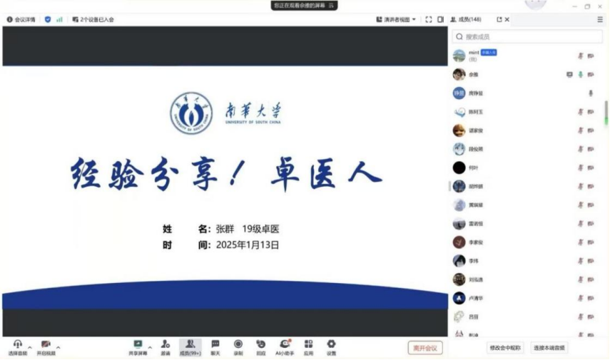 2019级优秀学生代表张群全面而深入地分享了自己在专业知识学习、英语学习、临床技能提升以及个人五年发展规划等方面的心得与宝贵经验。她的分享为24级的学弟学妹们指引了一条清晰的学习与成长之路,提供了极具启发性和实用性的参考方向。