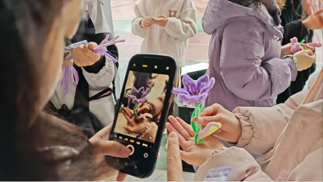 在“扭动春日,激发她创意”活动区域,同学们用五彩斑斓的扭扭棒,巧手编织出各种形状的手工艺品,展现了无限的创造力和想象力;在“烛光花语,点亮她光芒”活动区域,大家亲手制作干花蜡烛,将干花与蜡烛完美结合,烛光摇曳中透露出温馨与浪漫;在“扇动春风,绘出她色彩”活动区域,同学们则尝试运用非遗工艺制作漆扇和漂漆书签,绘制出春天的美景和独具特色的图案。同时,点歌唱歌环节也是热闹非凡,同学们纷纷上台献唱,悠扬的歌声和雷动的掌声交织在一起,将现场气氛推向高潮。