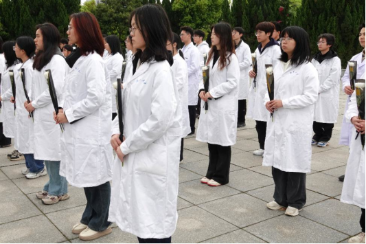 上午9时,祭扫仪式在庄严的国歌声中拉开序幕。师生手持白花肃立,面向烈士纪念碑齐唱国歌、垂首默哀,陵园内气氛凝重。学工办主任李翼在致辞中深切缅怀先烈,他表示:“先烈们用生命诠释的家国情怀,是新时代医学生赓续的精神火炬。我们当以守护人民健康为己任,在医学岗位上践行使命担当。”
