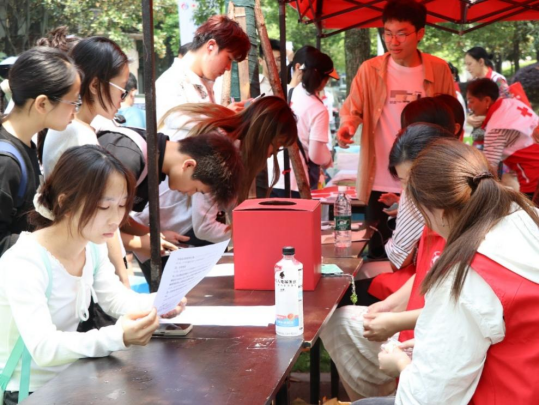 活动开始前,求是园食堂侧面的空地上就已经搭建起了多个临时工作台,摆放着各种宣传资料和纪念品。展台前,医护人员正忙碌地准备着献血所需的器械和材料。同时,几位穿着红色马甲的志愿者正在热情地向过往的学生分发宣传册,耐心地解答着关于献血的疑问。