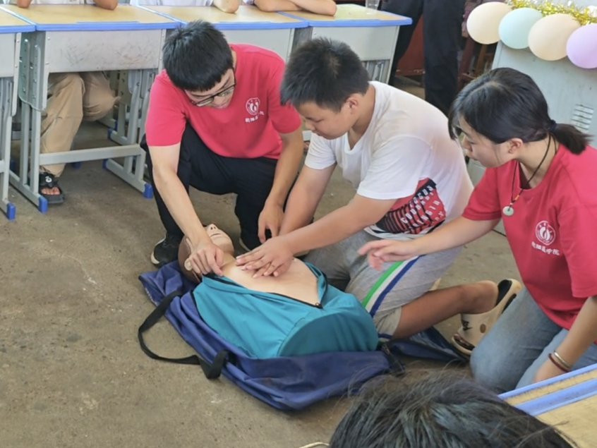 活动现场,志愿者陈疆、王彭梓宸化身“安全小导师”,围绕留守儿童日常生活中易遇的溺水、异物卡喉等安全隐患,聚焦心肺复苏、海姆立克急救法两大核心技能展开教学。陈疆用孩子们听得懂的语言,结合农村常见场景举例:“如果小伙伴在池塘边玩耍时不慎落水,上岸后没有呼吸,我们要这样做……”生动讲解了人工呼吸的操作要点和异物卡喉时的自救互救技巧;王彭梓宸则借助专业假人模型,一步一分解演示心肺复苏的按压深度、频率等关键细节,手把手纠正孩子们的动作,让抽象的知识变得可触可学。