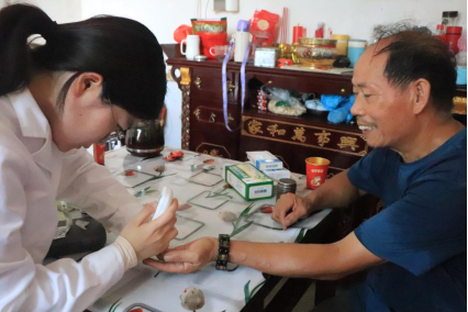 依据首日建立的健康档案和登记标记,回访团队逐户上门。在村民家中,医学生们俯身床前,耐心为老人复测血压、血糖等关键指标,与首日数据进行专业比对分析,动态更新健康档案信息,并据此调整健康建议、指导家属护理要点,实现了健康管理从“一次服务”向“动态追踪”的关键延伸。