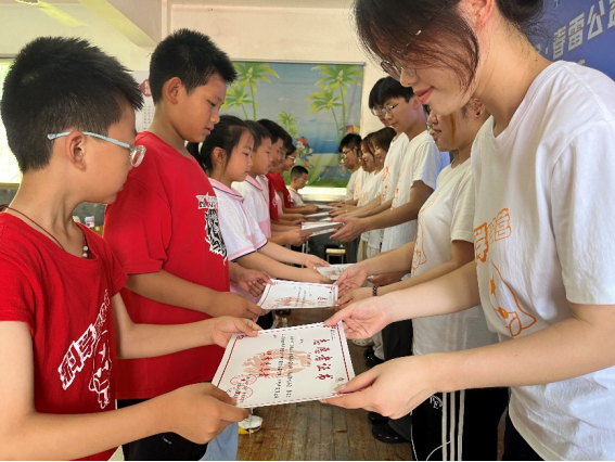 仪式尾声,“春晖医路,湘韵暖行”服务队为优秀营员颁发证书,表彰他们在课程中的积极表现;学生代表向志愿者老师颁发志愿者证书,感恩老师们的奉献与陪伴。