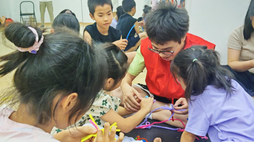 “看!我的蜘蛛有八条腿!”8岁的乐乐举着歪歪扭扭的绒花作品,小脸涨得通红。在志愿者手把手指导下,孩子们从基础绕线学起:左手捏住铁丝骨架,右手缠绕绒线,指尖翻飞间,伞骨、蛛网、花瓣逐渐成形。过程中,部分孩子因步骤繁复遇阻,但在志愿者“慢慢来,你做得很棒”的鼓励下,始终专注投入,反复练习直至掌握要领。当形态各异的绒花作品完成时,孩子们脸上洋溢着自豪的笑容。