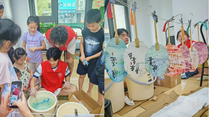 漆扇制作区域秩序井然。面对未知的创作成果,孩子们踮脚张望染料池,眼睛发亮地挑选心仪色彩。当素扇缓缓浸入水中,流动的色彩在扇面晕染出独一无二的纹路,如同揭开神秘面纱般渐次显现。漆扇的不可预测性既能够激发孩子们的探索欲,又以流动的色彩冲击视觉,让传统文化在童心中留下鲜活印记。