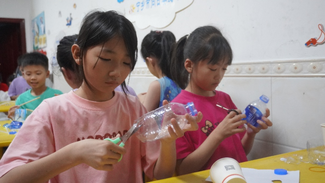 在手工创作环节课堂上,志愿者用一个塑料瓶做成一朵小花并且播放视频展示了一系列创意作品。活动现场气氛热烈,孩子们专注投入,欢声笑语不断。在志愿者指导下,孩子们化身小小发明家施展创意:塑料瓶经剪画变成插着纸花的童趣花瓶;普通纸杯通过叠粘化作威风长龙;瓶盖与筷子巧妙拼接成能“跑”的小汽车……孩子们不仅锻炼了动手能力和创造力,更深刻体会到了“变废为宝”的成就感和环保的意义。