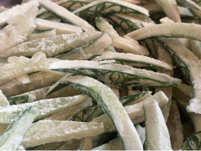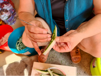 经过阿姨的短暂教学后,队员们跃跃欲试,拿起柳叶刀尝试雕刻,可这项技艺真不是那么简单。有的队员刚下刀就把冬瓜片划得歪歪扭扭,有的则因力度没掌握好,直接将薄薄的冬瓜片戳破了。“别急,手腕要稳,顺着纹路走。”阿姨见大家手忙脚乱的样子,耐心地在一旁指导。她握住汤愉的手,带着她一点点勾勒出简单的花瓣轮廓,“你看,这样轻轻转着刀,花纹就流畅了。”在阿姨的悉心指导下,队员们渐渐找到了感觉,雕刻出的图案也有了几分模样。看着眼前忙碌的年轻身影,叔叔露出了欣慰的笑容:“你们年轻人愿意学,这手艺就有希望!”