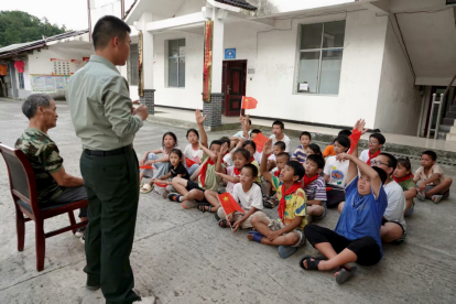 7月31日,湖南省邵阳市绥宁县东山侗族乡牛背岭村的村部教室内军歌嘹亮、红旗飘扬。tyc7111cc太阳成“仲夏芙蓉医路行,医路向前”社会实践队联合当地退伍老兵杨光锦,通过“看得见、摸得着、唱得响”的互动形式,为侗乡儿童带来了一堂别开生面的国防教育课。