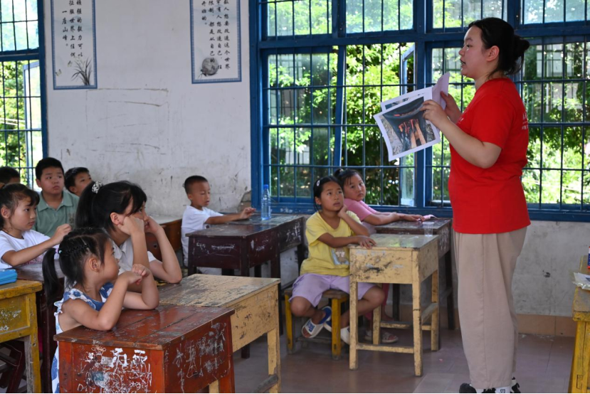 7月30日,队员欧阳宇航、薛文珂开启生物多样性科普之旅。小学教室变“动植物博物馆”,队员借图片、标本、谜语,讲述本地动植物特征与意义,大鲵、睡莲等成“活教材” 。孩子们观察标本、中药材,在 “制作香囊” 环节,了解桂枝、茉莉花等药用价值,通过亲手制作,“人与自然和谐共生”的种子在孩子们心中悄然种下。
